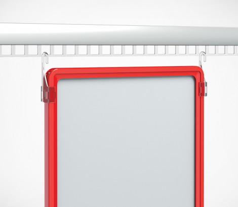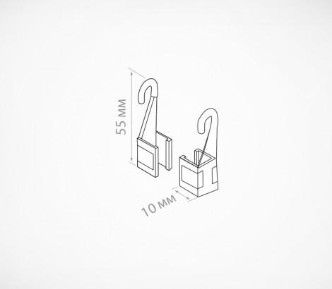 Фиксированный крючок для крепления пластиковых рамок в перфорированных вставках в подвесные профили. Для подвешивания одной рамки необходимо два крючка разной ориентации (правый и левый). Закрепляются на боковых поверностях рамки.