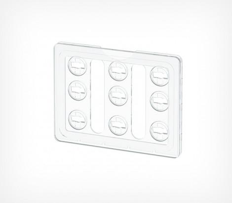Универсальная рамка-ценникодержатель с 2 гнездами для крепления рамки на разных уровнях относительно полки. Прорезь для вставки по широкой стороне рамки. Размер вставки - 74×53 мм.