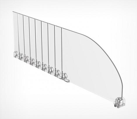 Разделитель DIV120-В выс.120 мм без ограничителя - предназначен для организации выкладки небольших лёгких товаров, таких как сигареты, лекарства, парфюмерия и косметика. материал: прозрачный ударопрочный пластик, имеет насечки с шагом 25 мм для обламывания по длине. Особенности: подходит для полок глубиной 200–400 мм. Задняя часть разделителя разделена на фрагменты, которые можно отрезать, чтобы регулировать длину. Для крепления на полку нужны специальные профили, которые фиксируются на переднюю и заднюю стороны полки. На передней и задней части разделителя есть вырезы (замки) для фиксации на профиль.