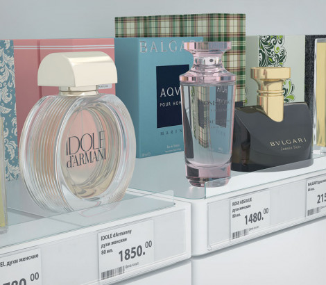 Предназначен для установки на узкие поверхности, такие как полки в магазинах косметики, парфюмерии, винных и книжных магазинах, а также аптеках. Монтируется с помощью двухстороннего скотча на любую ровную и гладкую поверхность.
