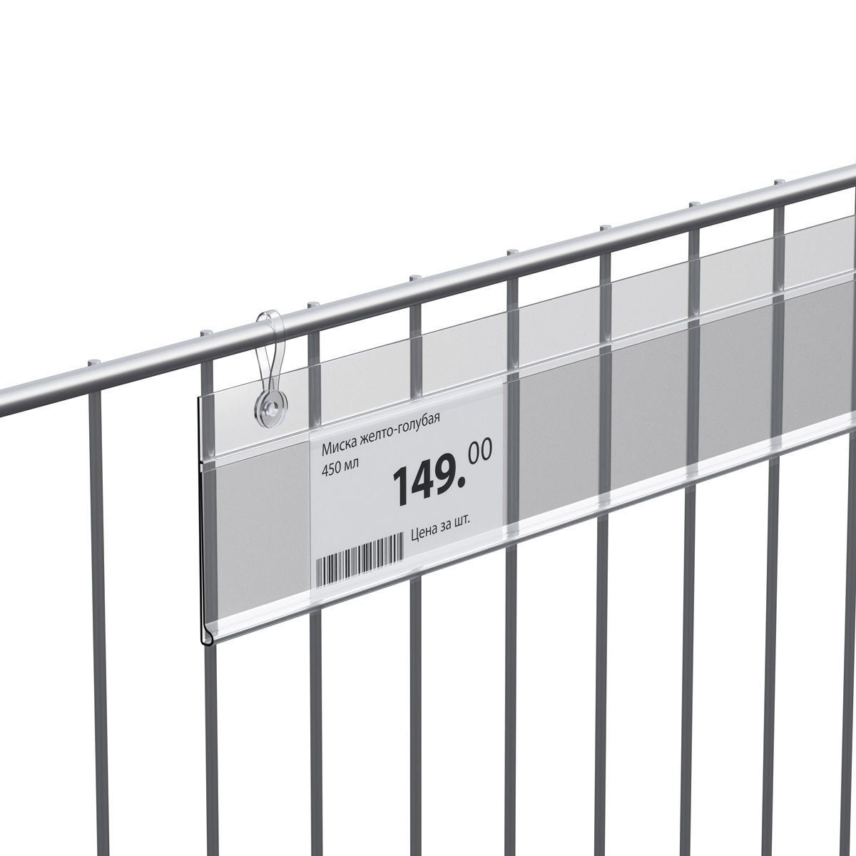 Универсальный ценникодержатель для подвешивания на проволочные корзины с помощью клипс. На профиле длиной 1000 мм требуется 6 клипс, на профиль длиной 1250 мм требуется 7 клипс.